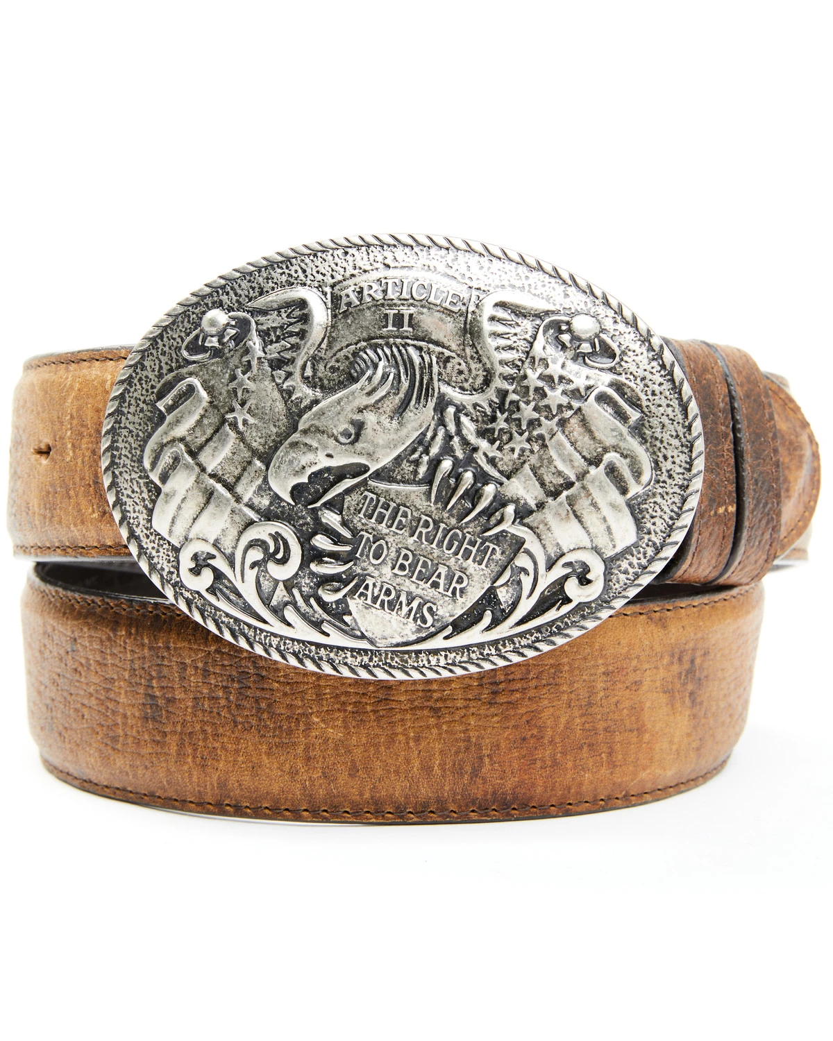 - Oval plate buckle with embossed eagle and flag patriotic details