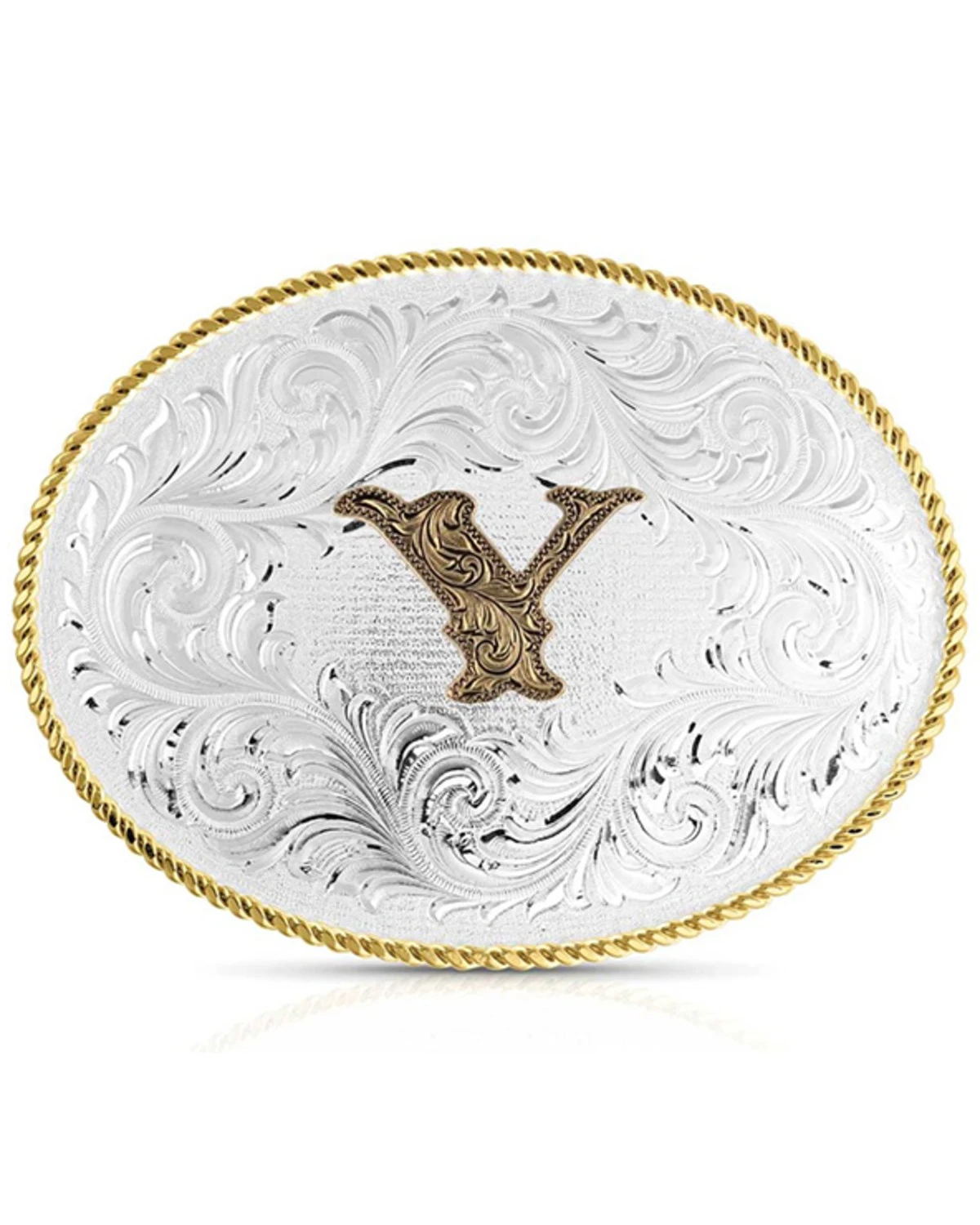 - Silver-toned oval buckle with gold roped border and “Y” on front with silver-toned filigree details