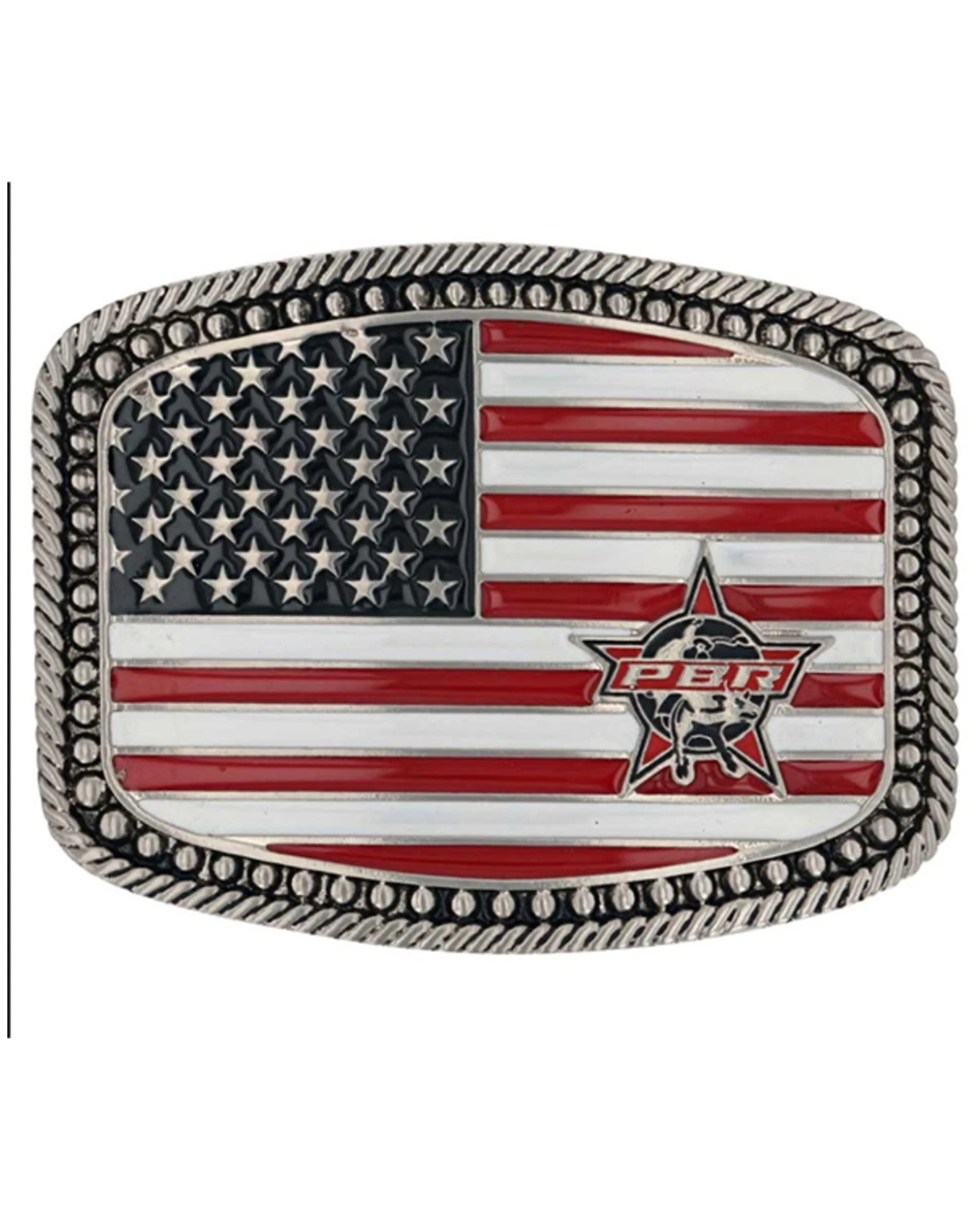 - Square cast buckle with painted American flag background with PBR logo